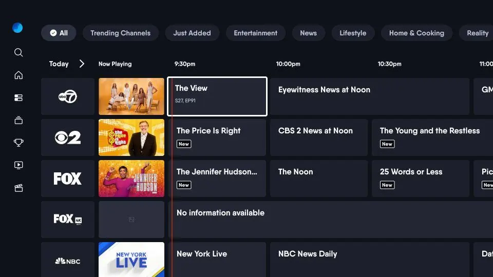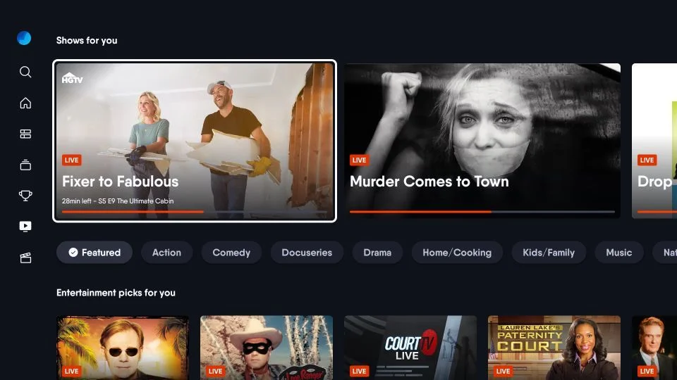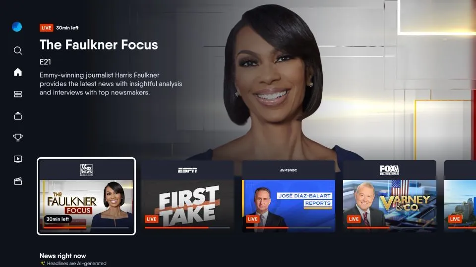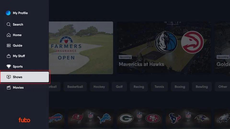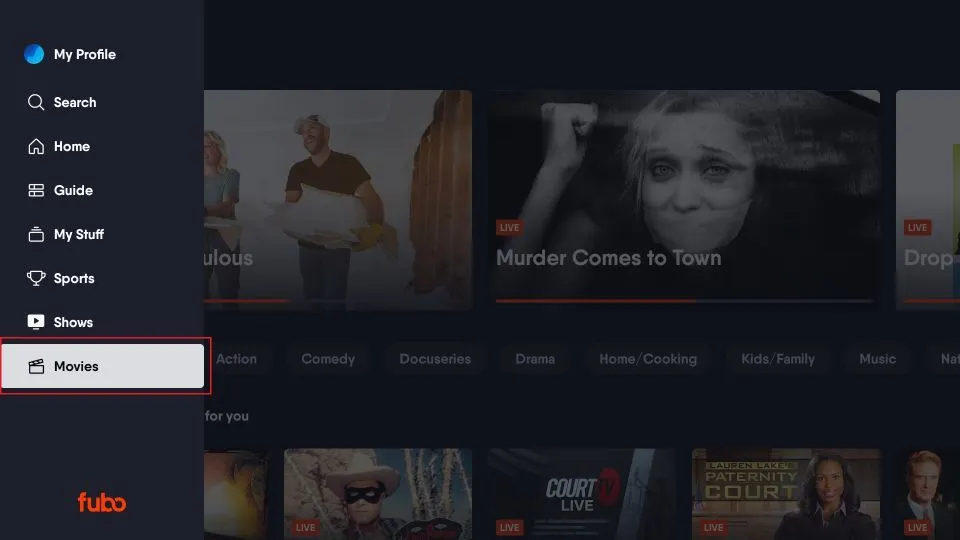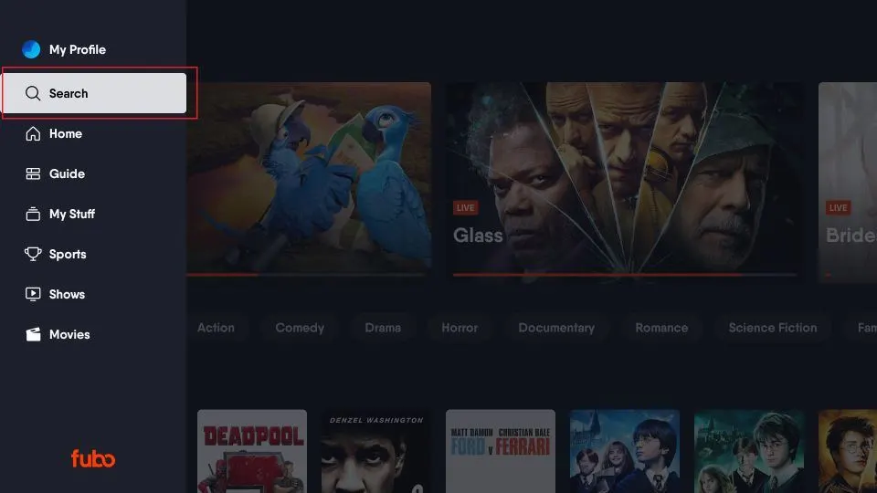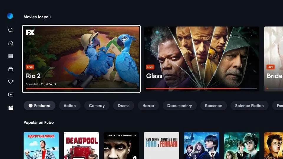 The Fubo home screen on FireStick has a layout similar to other streaming apps like Netflix and YouTube. The left-side menu allows you to access various sections, and the rows let you browse the content.