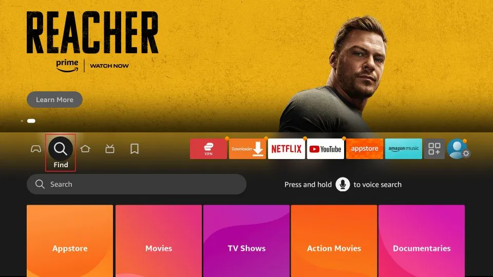 1. Power on your FireStick and navigate to the Find option on the home screen.\