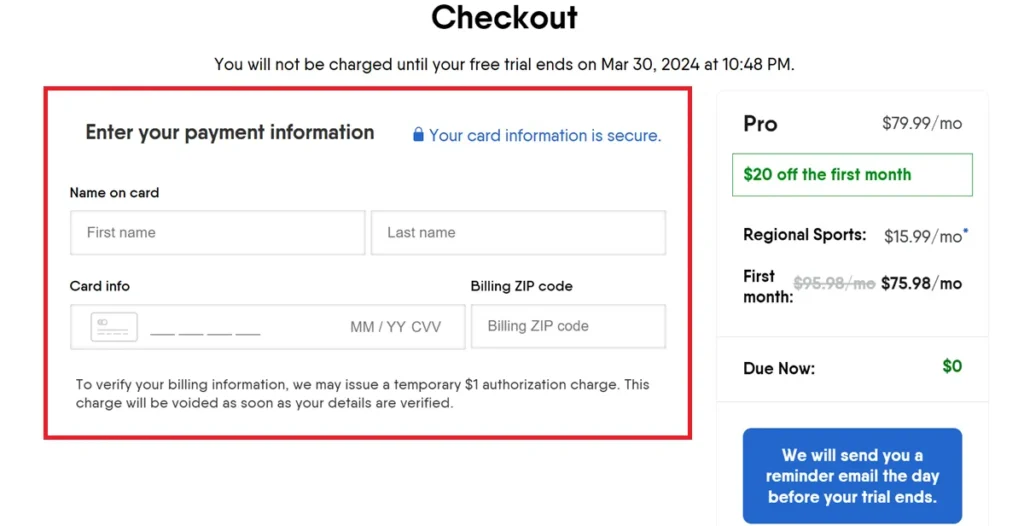 Enter Payment Information: Fill in your payment details, including the name on the card and card information. Scroll down and click Start Your Free Trial.