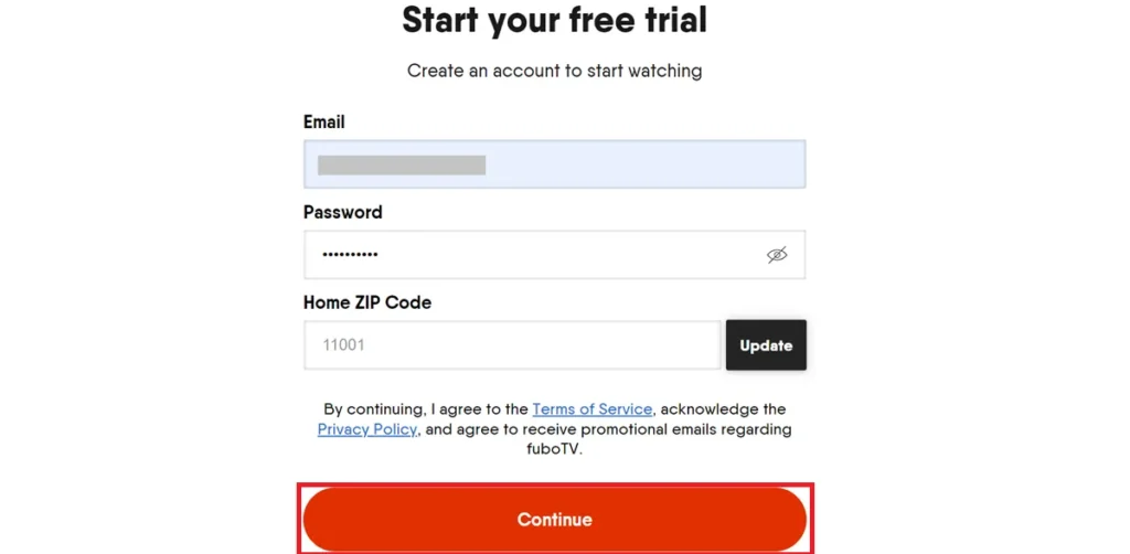 Enter Information: Provide your email, password, and home ZIP code, then click Continue.